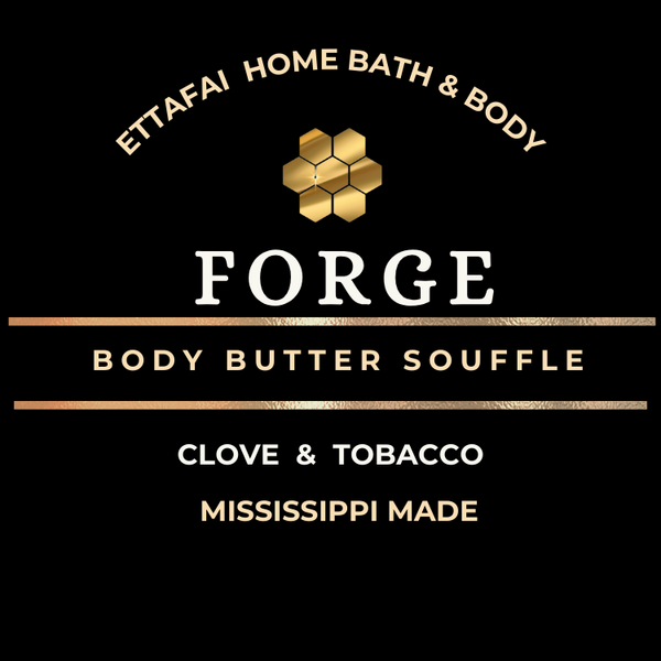 The "Forge - Body Butter Souffle" is a sacred and exclusive blend moisturizing body butter with a warm Clove and Tobacco fragranced oil infused in a Mango Butter and Shea Butter base with Kokum Butter, Apricot Oil, Jojoba Oil, Sweet Almond Oil, Beeswax and Honey. These ingredients will help your skin retain its moisture, reduce itchy and flaky skin, and even out skin tone when paired with your overall daily self-care routine.
